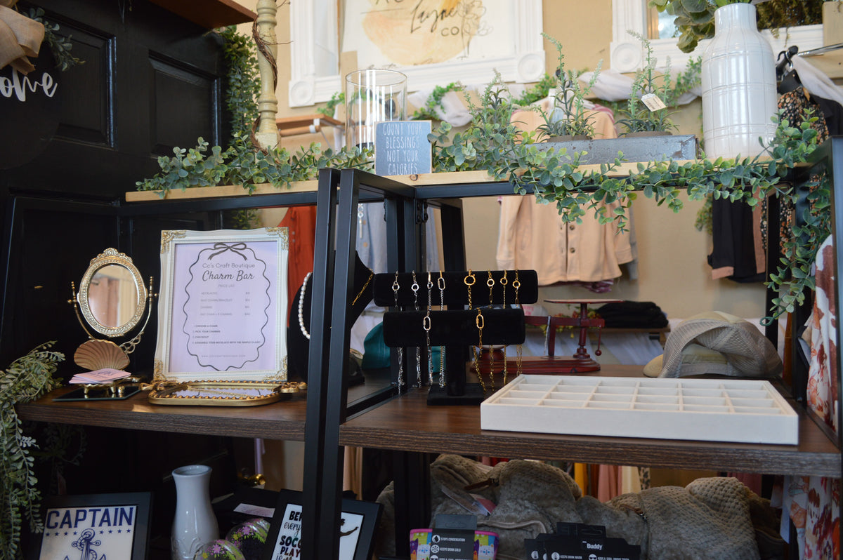 Find the charm bar, totes, duffles, sun-catchers, stationary, and hand-sewn creations here. Some products are available here before they hit the website! Other small business vendors are located in the boutique as well. It's a great place to support small creators.